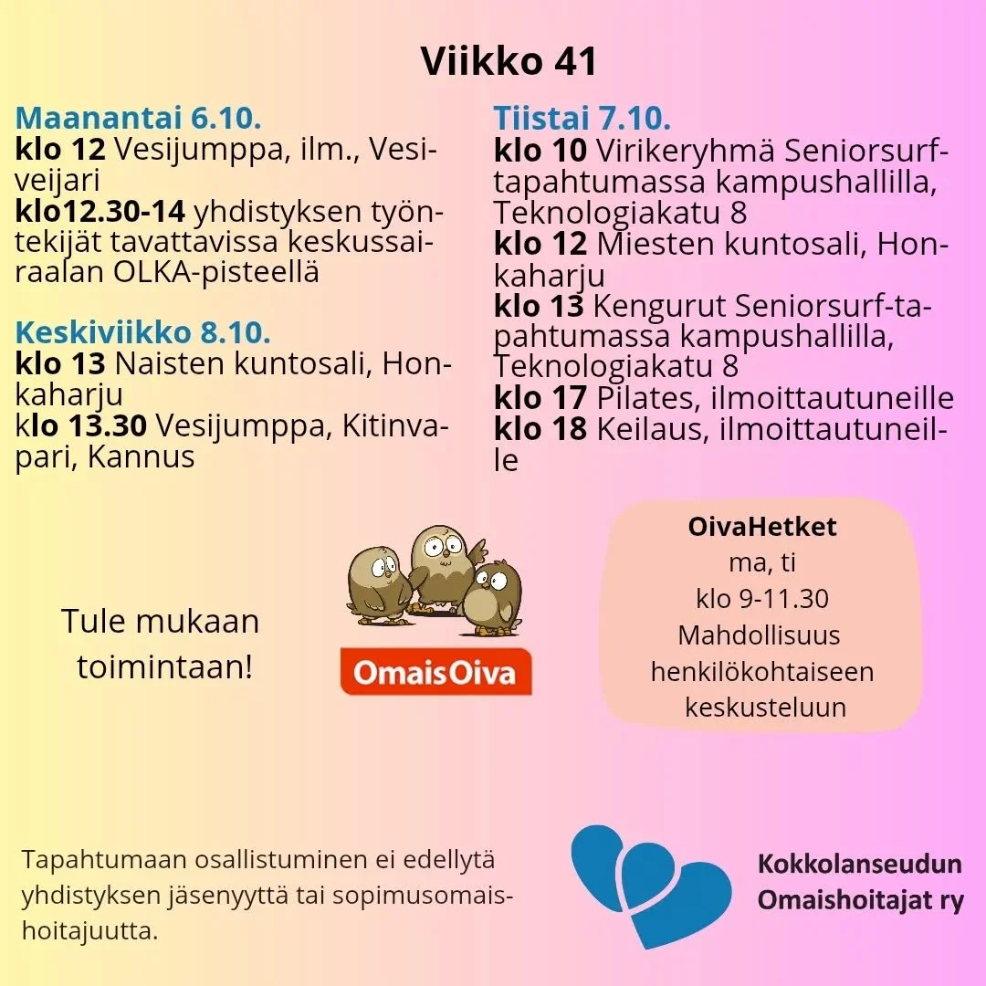 Autamme sekä tuemme omaishoitajia ja läheisistään huolehtivia henkilöitä jaksamaan paremmin arjessaan ja huolehtimaan hyvinvoinnistaan. Meiltä saa tietoa sekä tukea erilaisiin omaishoidon tilanteisiin ja -vaiheisiin. Huomioimme toiminnassamme myös heidät, jotka eivät vielä tunnista omaishoitajuuttaan ja jotka auttavat enenevässä määrin läheistään.